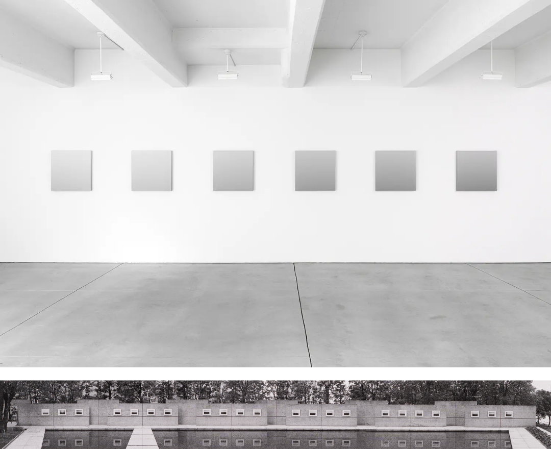 Top: James Howell (American, 1935–2014). Sets 71.68–88.84; Six-Part progression 10/23/11, 2011, acrylic on canvas, 25 x 25 in. Photo by Mareike Tocha, Courtesy of the James Howell Foundation. Bottom: Hiroshi Sugimoto (Japanese, b. 1948). INM Courtyard, Tokyo, 1991, photolithograph 9 ½ x 12 in. Parrish Art Museum, Water Mill, New York, Gift of the Joy of Giving Something, Inc. 2022.7.51.