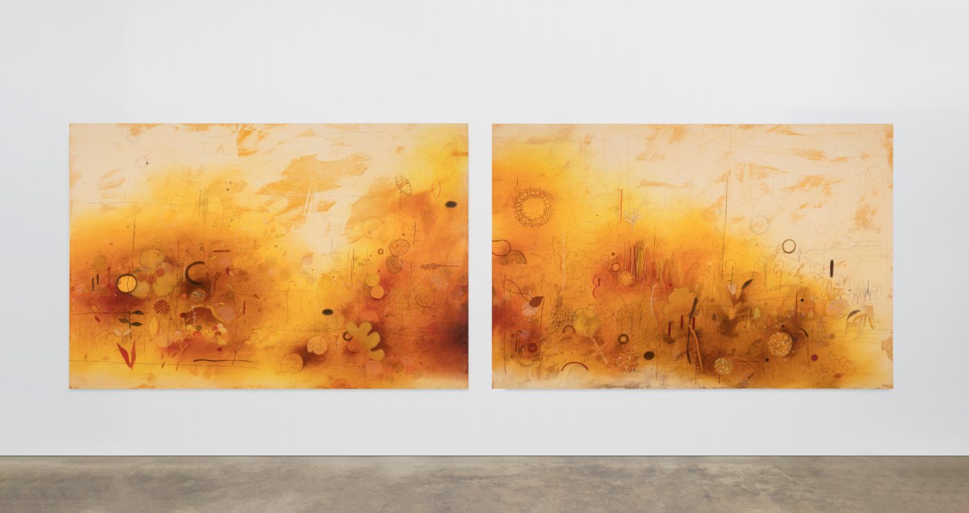 Whitehorse’s paintings reflect the Navajo worldview of Hózhó, which the artist describes as “a harmonious balance of beauty, nature, humanity, and the whole universe.” While her works evoke a sense of stillness, it is the fleeting and minute events of nature that speak to Whitehorse: ripples on water, insects moving across the ground, grasses shifting in the wind. The constellations of forms that emerge from and sink into her painted surfaces serve as a reminder of the transitory, ever-shifting nature of life.