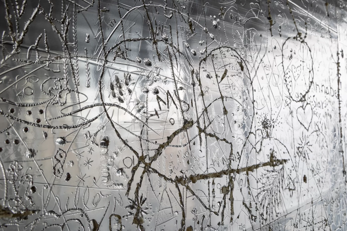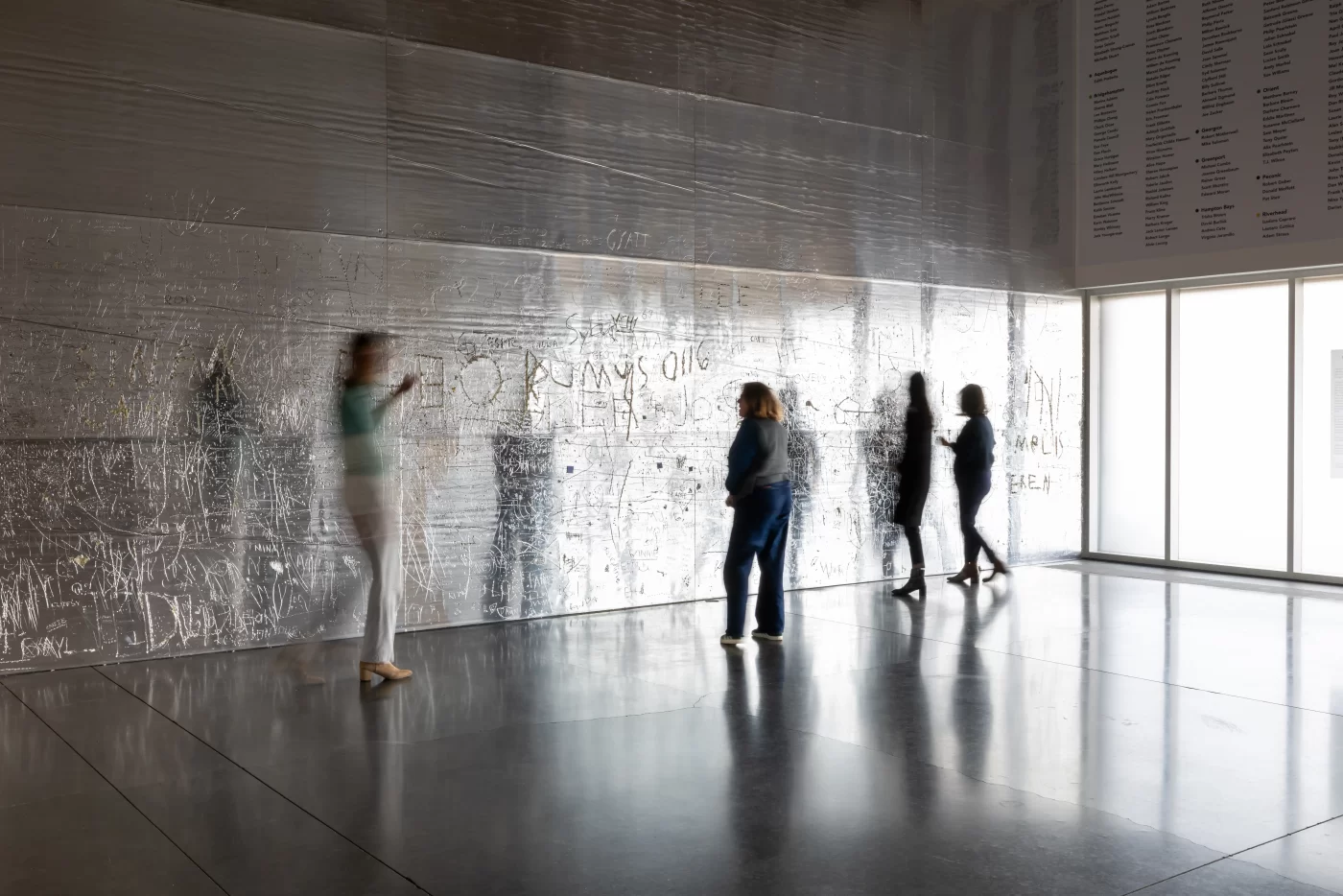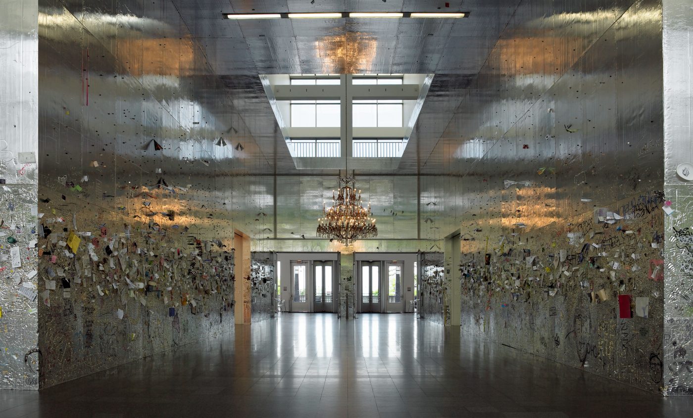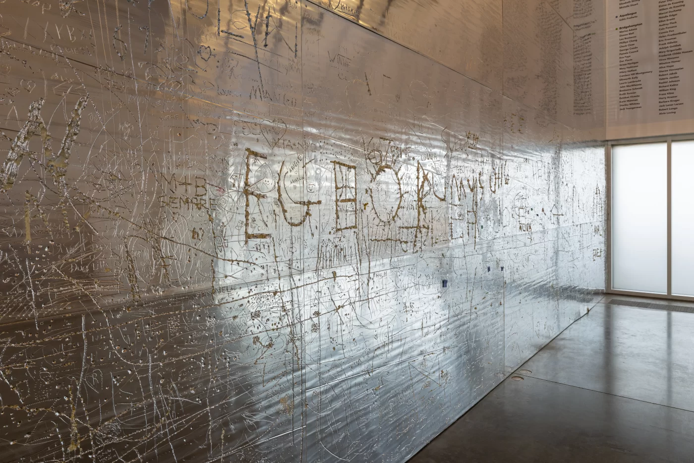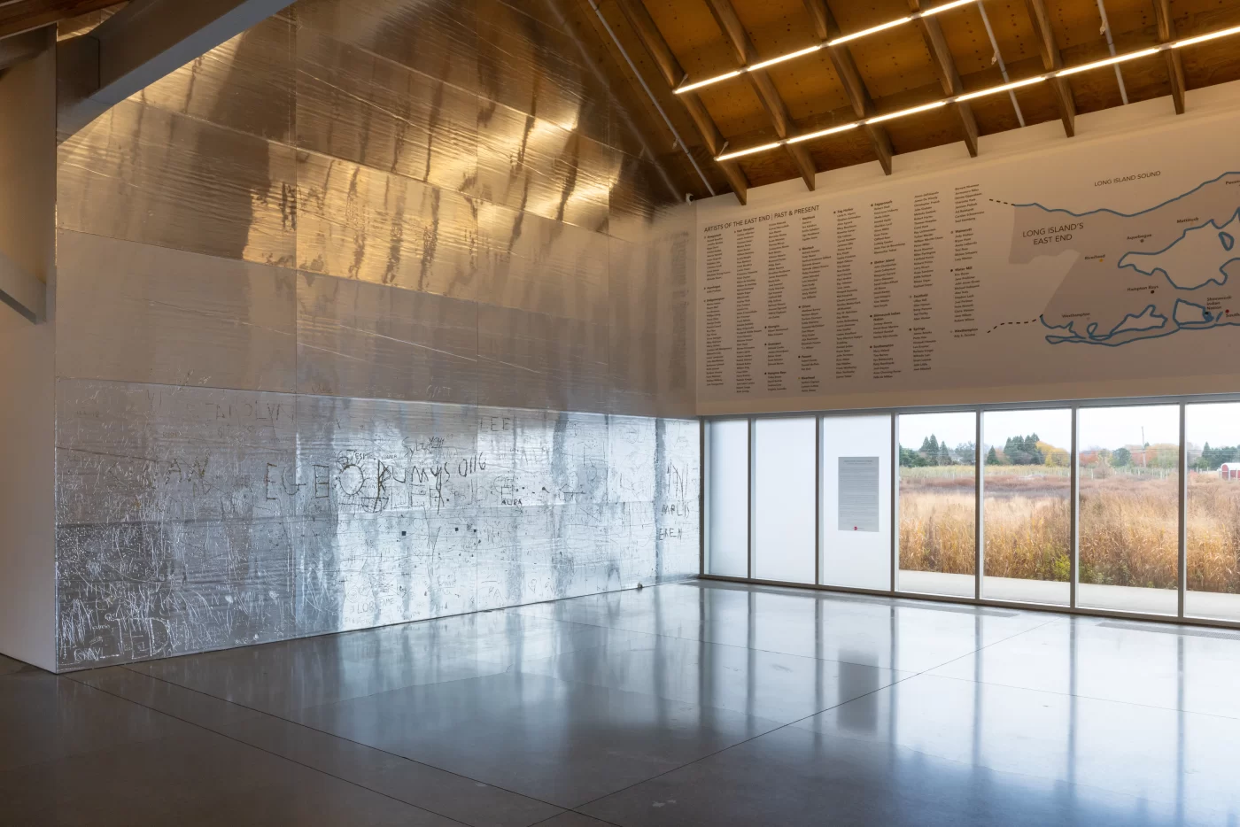 The Parrish Art Museum and The FLAG Art Foundation continue their FRESH PAINT collaboration with a new work by the artist Rudolf Stingel (American, b. Italy, 1956). At the Parrish, Stingel will present Untitled (2025), a large-scale, interactive installation in the Museum’s Interior Lobby. Untitled is made from a series of Celotex panels—aluminum-faced foam insulation boards—that will cover the entirety of the Lobby’s eastern wall. Its shimmering metallic surface is also malleable and receptive to pressure, inviting visitors to draw into the work’s surface and leave behind marks and impressions of their own designs. Referencing the acts of graffiti and drawing into wet cement, the installation will continue to gather layers of line, text, and image over the course of the presentation, amassing into an extended collaboration between Stingel and the many visitors who come through the Museum’s doors.