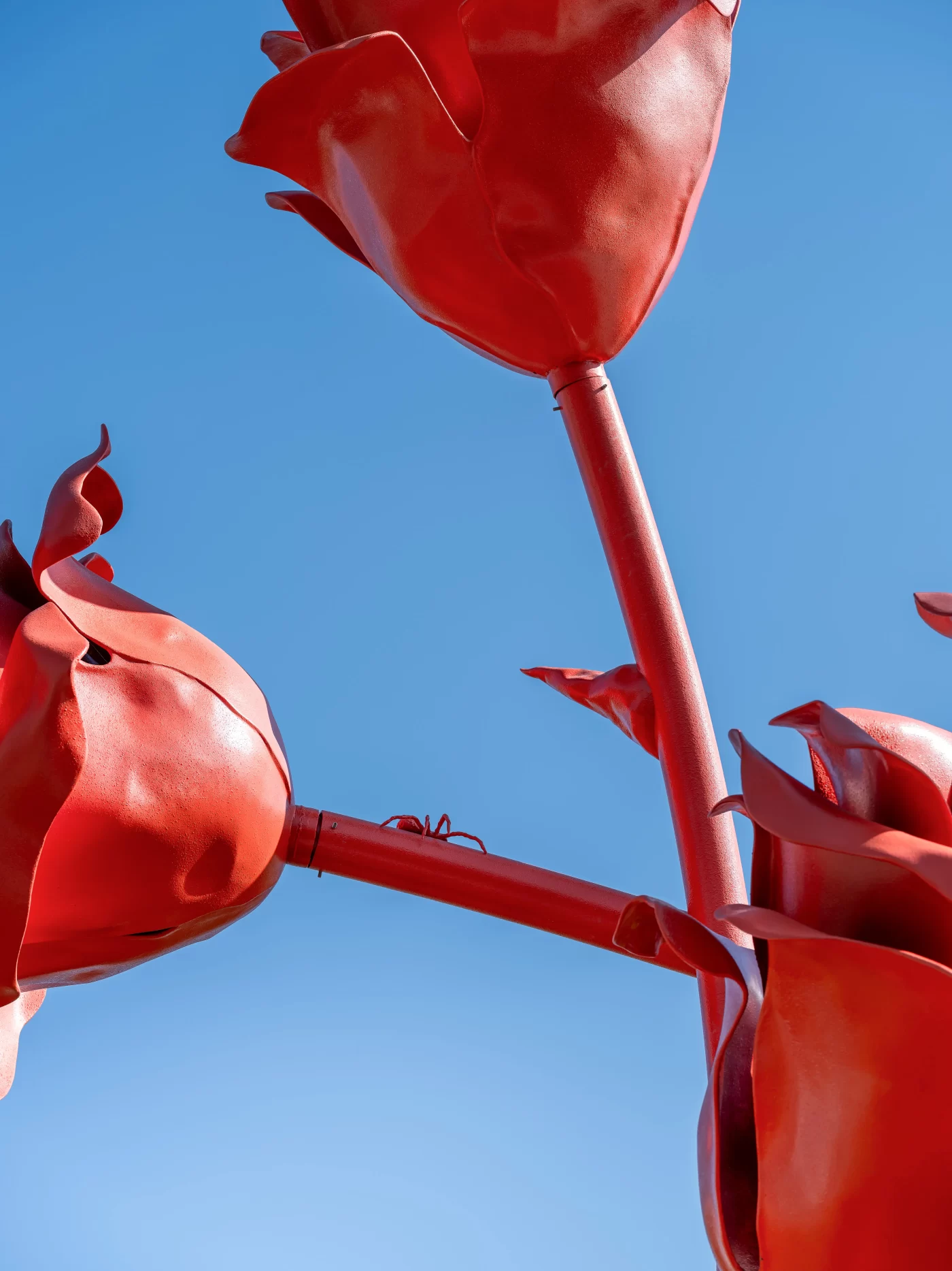Prized for its beauty, the rose is a universal symbol of love which has been depicted in art and literature for ages. In Ryman’s hands, roses and petals intentionally bloom to an outrageously absurd size meant to consume viewers into a transformed landscape and raise questions associated with capitalism and culture: What does a rose represent to a person? What does it signify for those who tend to a rose or admire one, and what does it mean to those who give a rose, or to those who receive one? By inflating his subject to such an extreme size, and inviting visitors to sit in oversized petals shed around towering stems, Ryman is intentionally creating a surreal space. This relates directly to his work in theater as a playwright and set-builder while prompting viewers to think about the independence and intersection of nature and commerce.