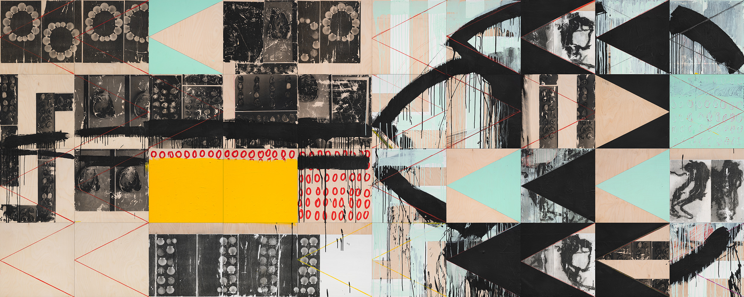Sara Siestreem (Hanis Coos), sugar kelp, 2025, acrylic, graphite, Xerox on panel boards. 80 x 200 in. Courtesy the artist and Cristin Tierney Gallery, New York.