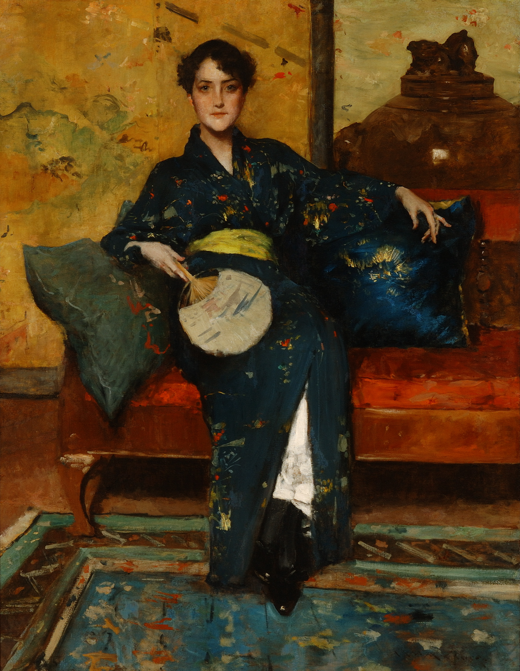 William Merritt Chase (American, 1849–1916). A Comfortable Corner (The Blue Kimono), ca. 1888, oil on canvas, 57 x 44 ½ in. Parrish Art Museum, Water Mill, N.Y., Littlejohn Collection, 1961.5.21.