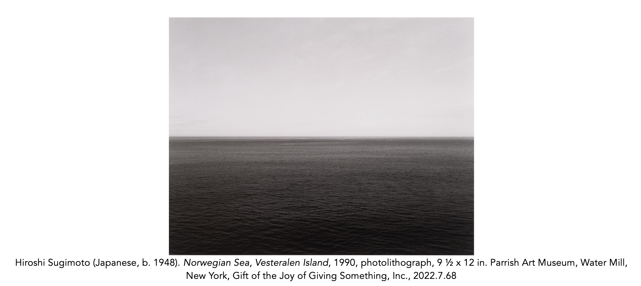 A presentation of Hiroshi Sugimoto’s (Japanese, b. 1948) black-and-white seascapes for the first time at the Parrish Art Museum. Acquired by the Museum in 2022, the photolithographic series explores Sugimoto’s unwavering interest in the incremental atmospheric changes around vast bodies of water. The Time Exposed project saw Sugimoto use a 19th-century film camera to document the subtle changes in light, fog, and atmosphere.