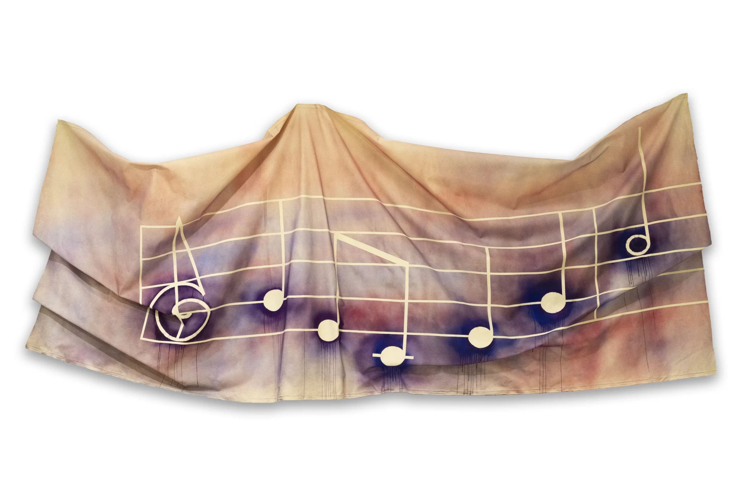 Nina Yankowitz (American, b. 1946). Oh Say Can You See – A Draped Sound Painting, 1967-68, latex paint on cotton duck, audio by Phil Harmonic a.k.a. Ken Werner – to be played on floor speaker, 48 x 120 x 6 in. Courtesy of Artist.