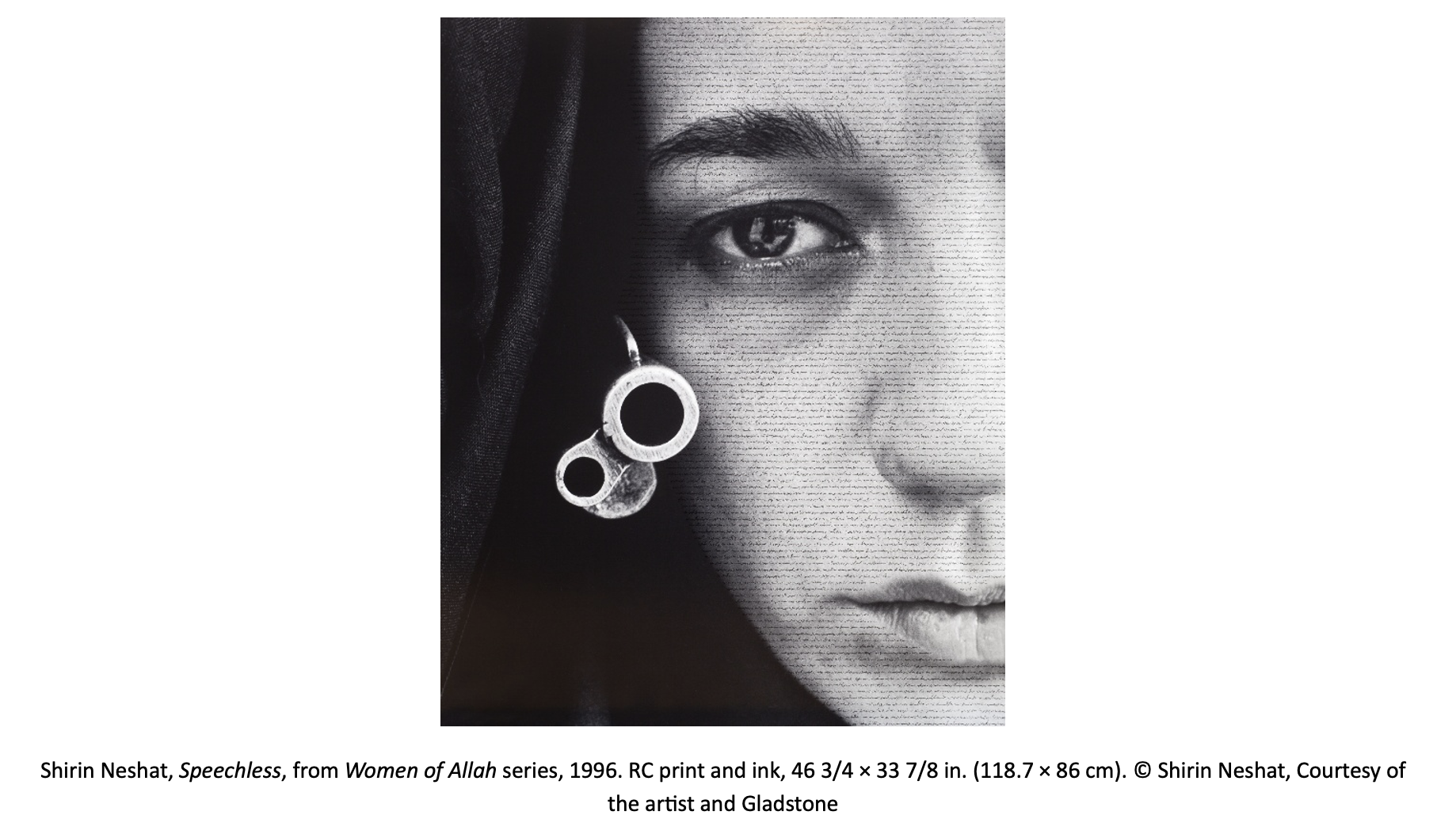 “I made this body of work …following my first trip to Iran since the 1979 Iranian Revolution. With this series, I began an uncompromising journey of experimentation and discovery, using art as the means to resolve personal dilemmas… Four symbolic elements recur in this work: the veil, the gun, the text, and the gaze. Despite the Western representation of the veil as a symbol of Muslim women’s oppression, the subjects of these images look strong and imposing. In fact, the use of the black veil as a uniform has transformed the feminine body into that of a warrior, determined and even heroic…. Although the Persian words written on the works’ surfaces may seem like a decorative motif, they contribute significant meaning. The texts are amalgams of poems and prose works mostly by contemporary women writers in Iran. These writings express sometimes diametrically opposed political and ideological views, from the slogans of martyrdom and self-sacrifice to poetic, sensual, and even sexual mediations.” — Shirin Neshat