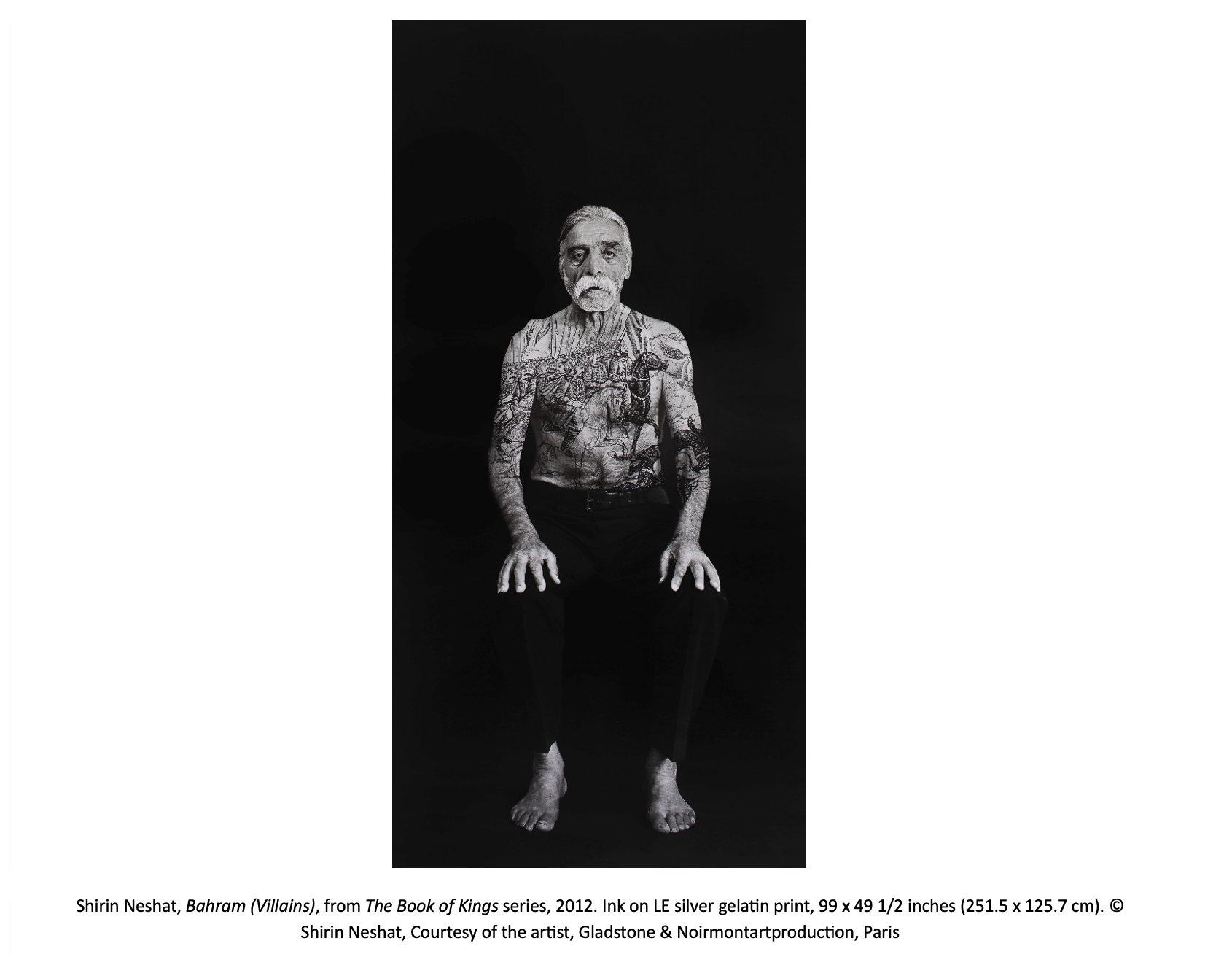 Inspired by eleventh-century poet Ferdowsi’s Shahnameh, the pre-Islamic Persian epic, The Book of Kings is a large-scale photographic installation exploring the concept of patriotism. In this series of staged photographs, Neshat makes visual and allegorical parallels between ancient and contemporary history and the notion of heroism in her native country Iran. The work is divided into three societal groups: