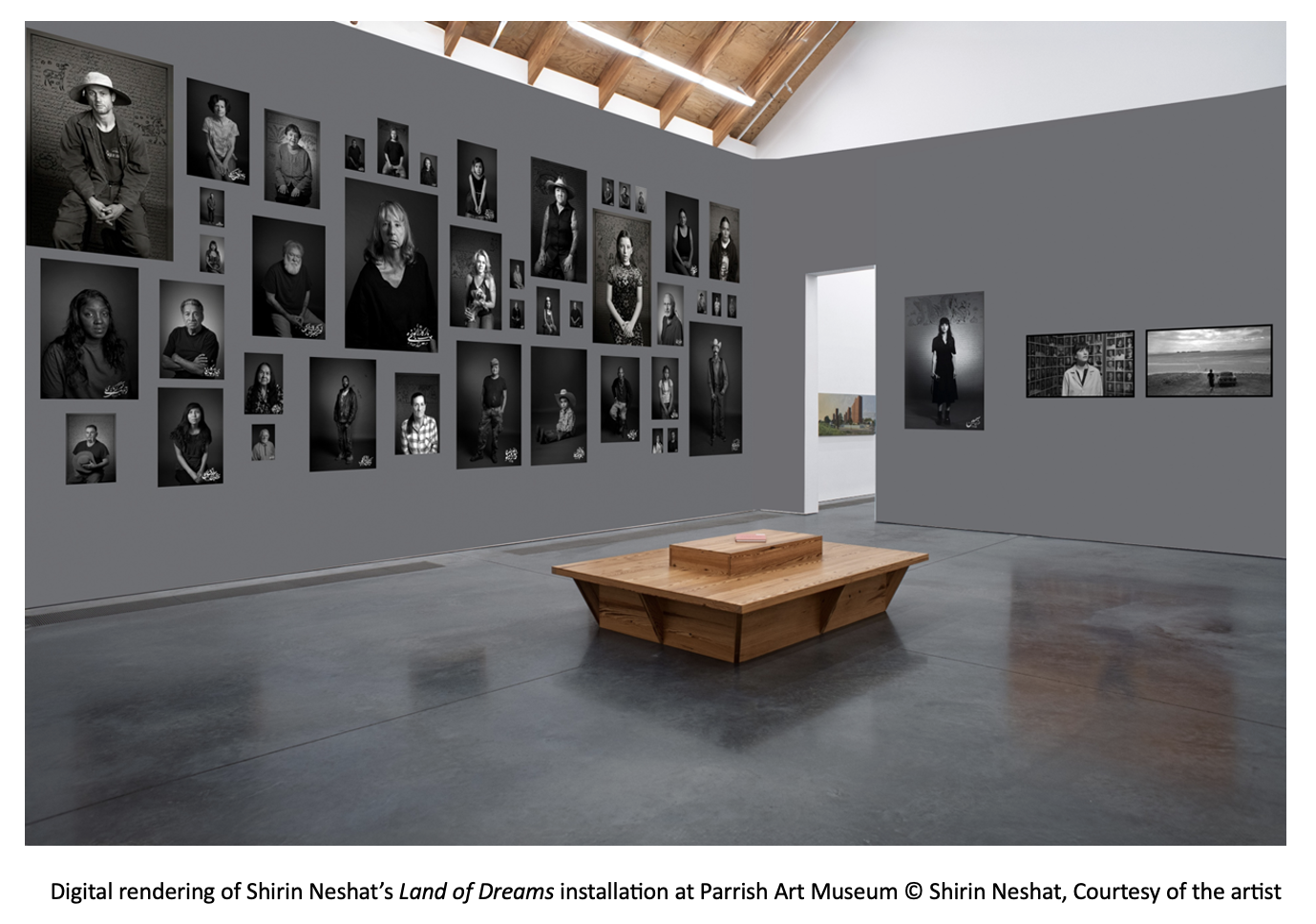 Shirin Neshat said the following about her exhibition at the Parrish Art Museum: “Shirin Neshat: Born of Fire is an exhibition that brings together my earliest to my latest work. The Women of Allah (1993-1997) and The Book of Kings (2012) photographic series capture the most significant historical and political upheavals in Iran in modern times, the 1979 Islamic revolution and the 2009 Green movement. With Land of Dreams (2019) for the first time, I turn my lens toward the West and offer my point of view as an Iranian immigrant about America, a nation that once welcomed displaced immigrants, and how its core identity is now being compromised. Finally, The Fury (2023) touches on the systematic violence and sexual exploitation of women imprisoned as political detainees by men in uniforms.”