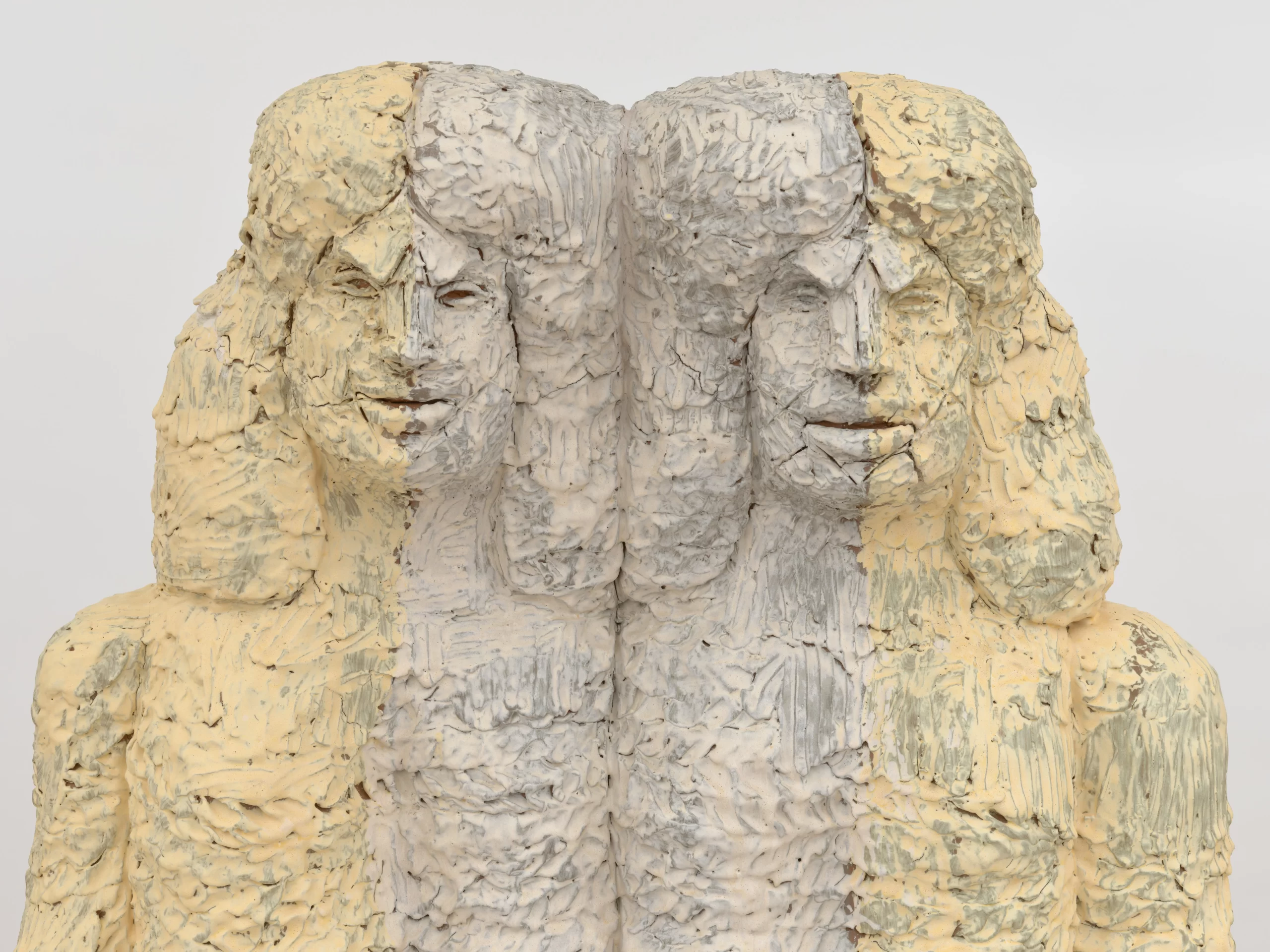 Raven Halfmoon (Caddo Nation, b. 1991). Sun Twins (detail), 2023, stoneware, glaze, 77 x 49 x 28 in. Courtesy of the artist and Salon 94 © Raven Halfmoon. Photo Credit: Elisabeth Bernstein.